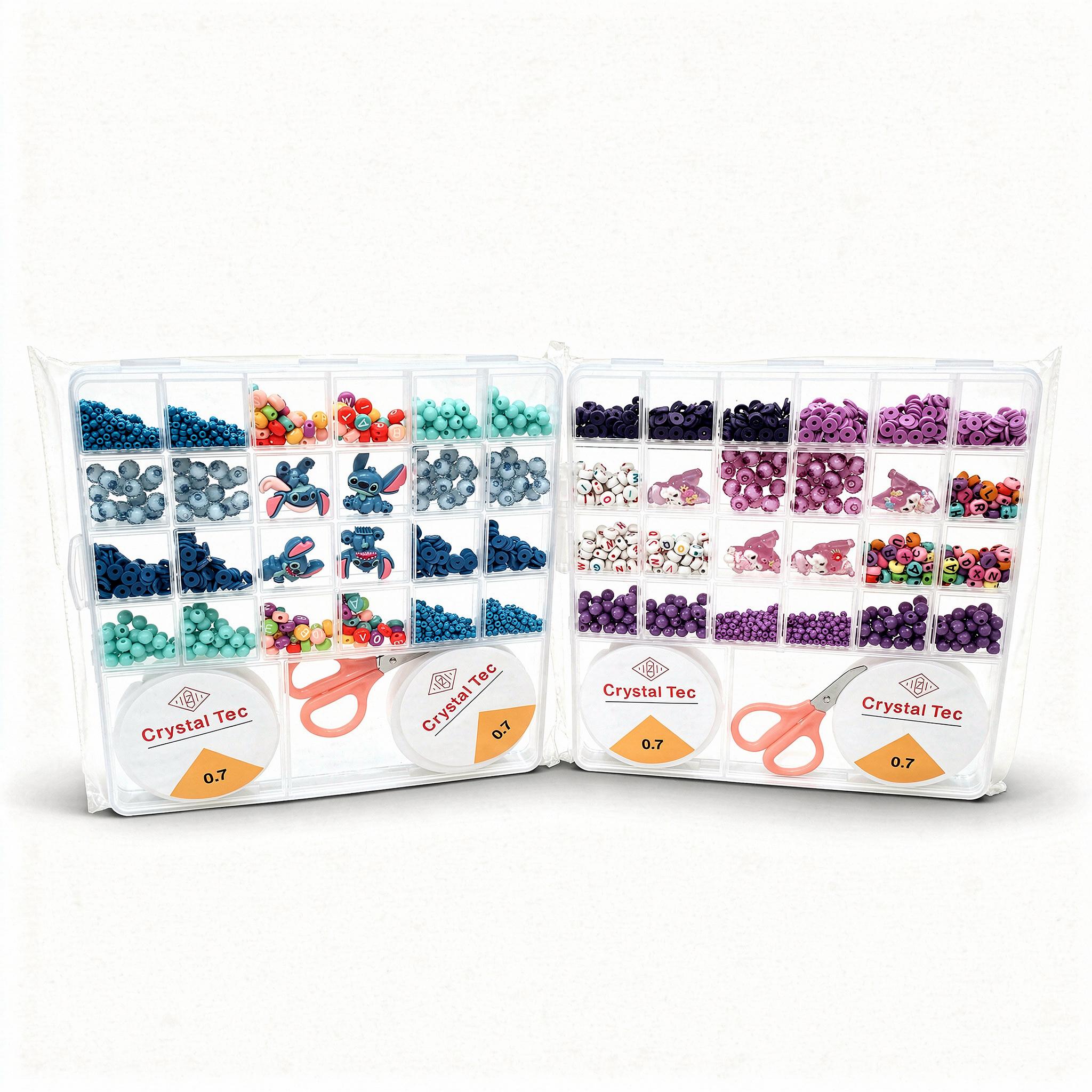 Il contient une large variété de perles colorées, perles lettres, perles fantaisie ainsi que deux rouleaux de fil élastique transparent Crystal Tec 0,7 mm.