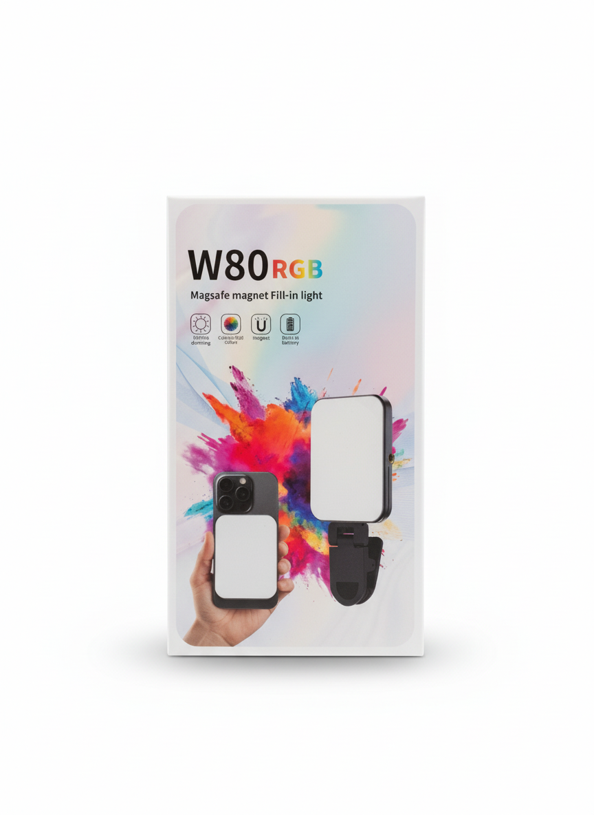 La W80 RGB Magnetic Selfie Light est une lampe selfie LED compacte dotée d’un système magnétique pour fixation facile sur vos appareils ou supports métalliques. Grâce à ses lumières RGB réglables, elle offre une variété de couleurs pour améliorer vos selfies, vidéos TikTok, Reels Instagram ou streaming en direct. Rechargeable et légère, cette lampe est parfaite pour un éclairage créatif, stable et efficace partout où vous en avez besoin.